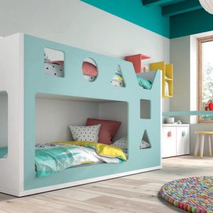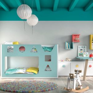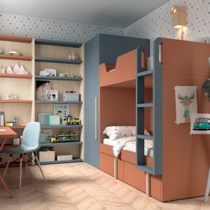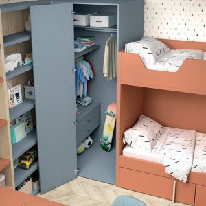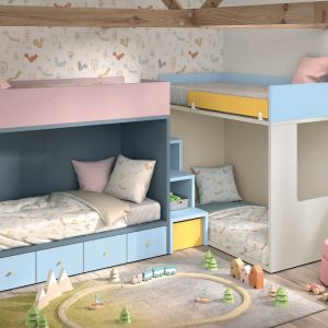 Tres camas en un reducido espacio con cajones contenedores. Una fuerte escalera en estructura de 4 cm con puertas y contenedor bien aprovechada