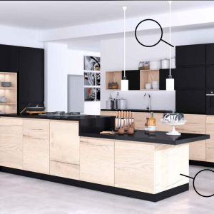 Lacado Cadaqués blanco brillo combinada con nogal acabado n8 en madera y vitrina Venecia en Negro